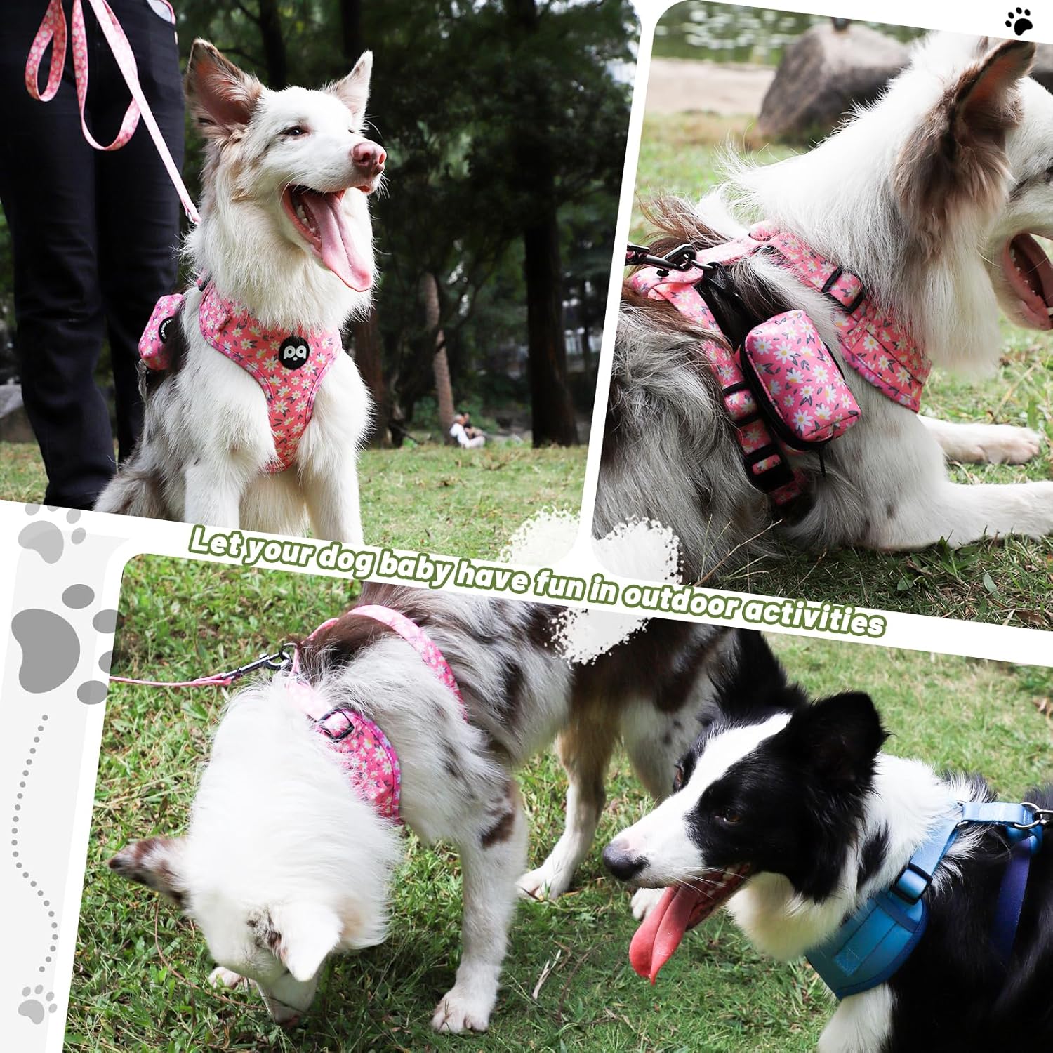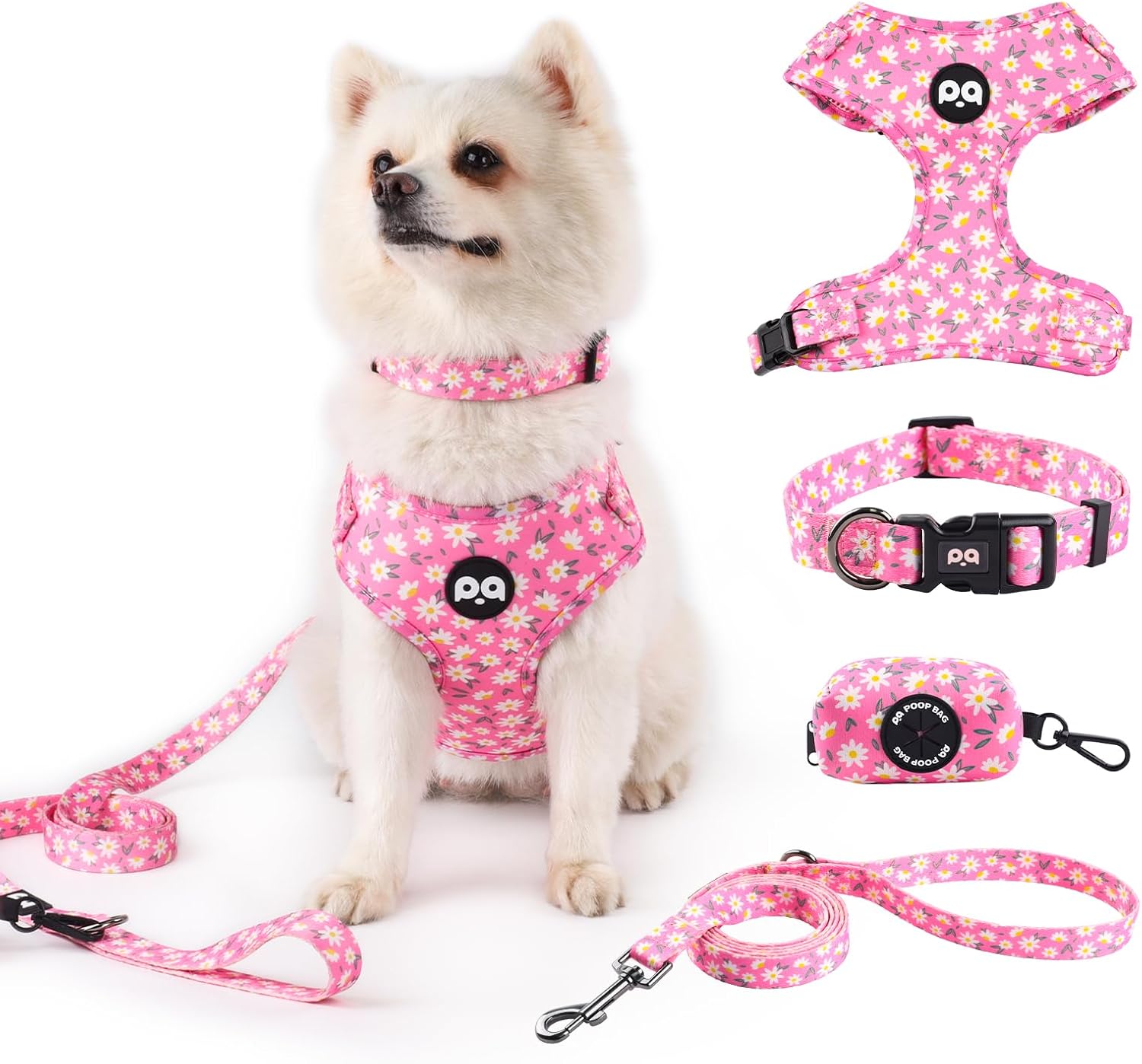 4 PCS Combo Set : Please accurately measure your dog and carefully select a harness by referring to the size chart. For a better fit for your adorable puppy, it is suggested that you choose a larger size. Package includes: 1 x Vest style dog harness, 1 x Leash and 1 x Dog collar,1 x Poop Bag Holder.