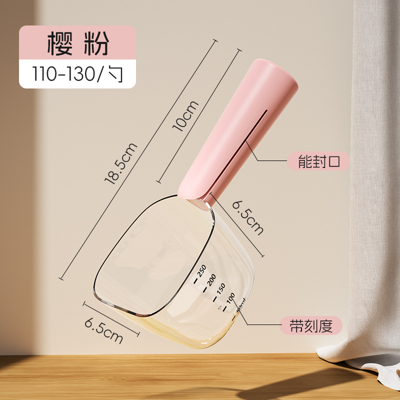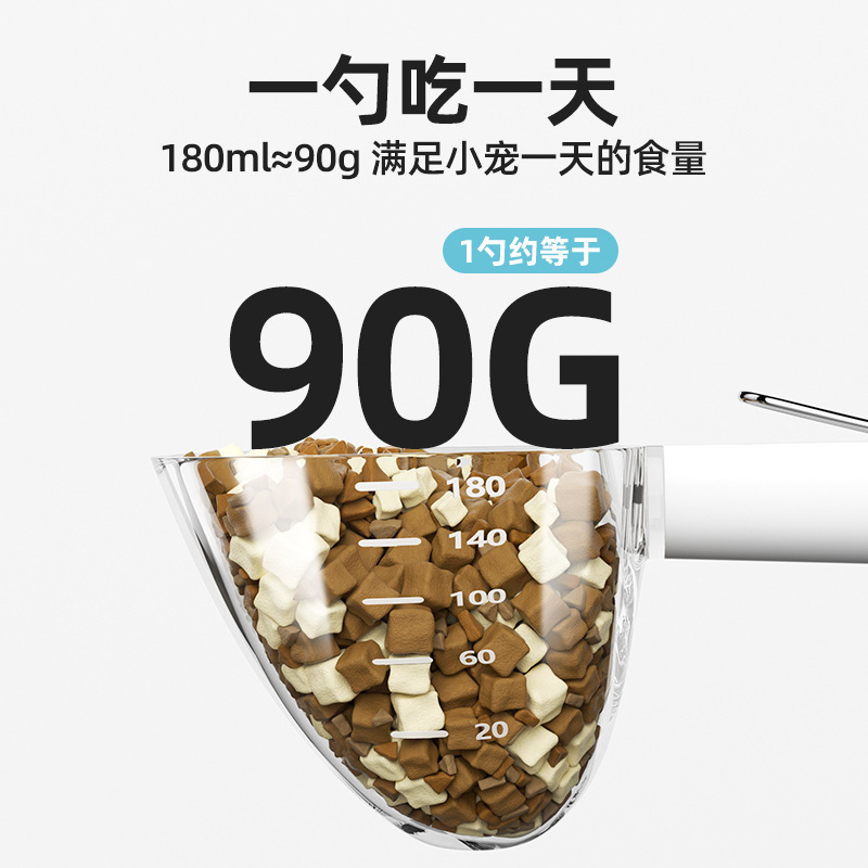 Transparent pet food scoop with graduations, multi-functional long-handled stainless steel dog and cat food scoop/measuring cup with closure.